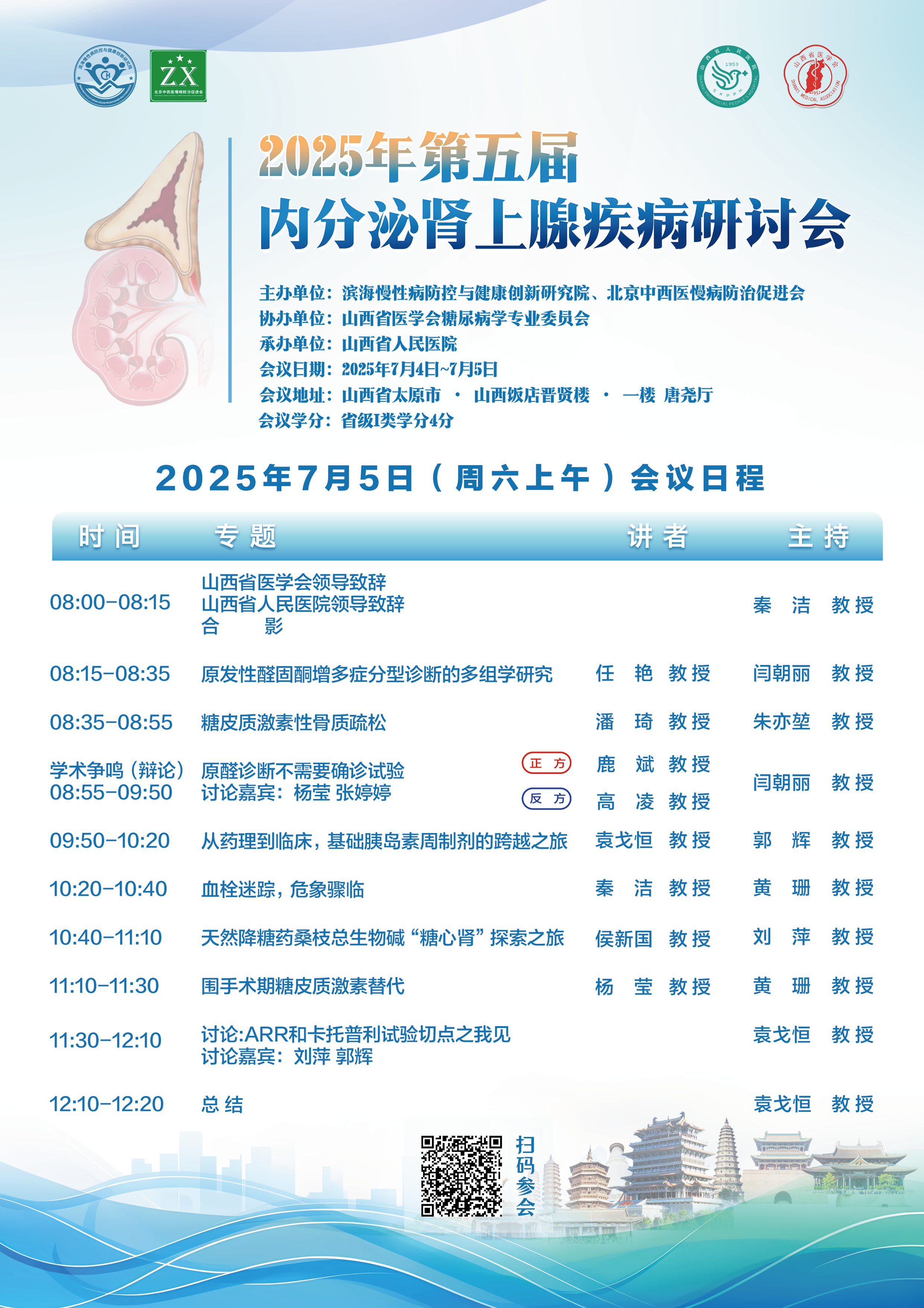 由北京中西医慢病防治促进会和滨海慢性病防控与健康创新研究院联合主办,山西省人民医院协办的“2025年第五届内分泌肾上腺疾病研讨会”将于2025年7月4日-5日在山西省太原市召开。 本次会议采用线上和线下相结合,汇聚全国中青年专家,保持历届年会传统特色,包括学术讲座、病例分享、热点辩论和经验分享等多种形式,涉及内分泌肾上腺疾病的难点和热点,紧贴临床。 三晋厚土,晋韵悠长。我们谨代表大会组委会诚挚邀请您的参与。让我们以此次交流为契机,携手并肩,共话内分泌学科未来发展蓝图。古韵悠长的龙城太原欢迎各位同道莅临和线上关注!