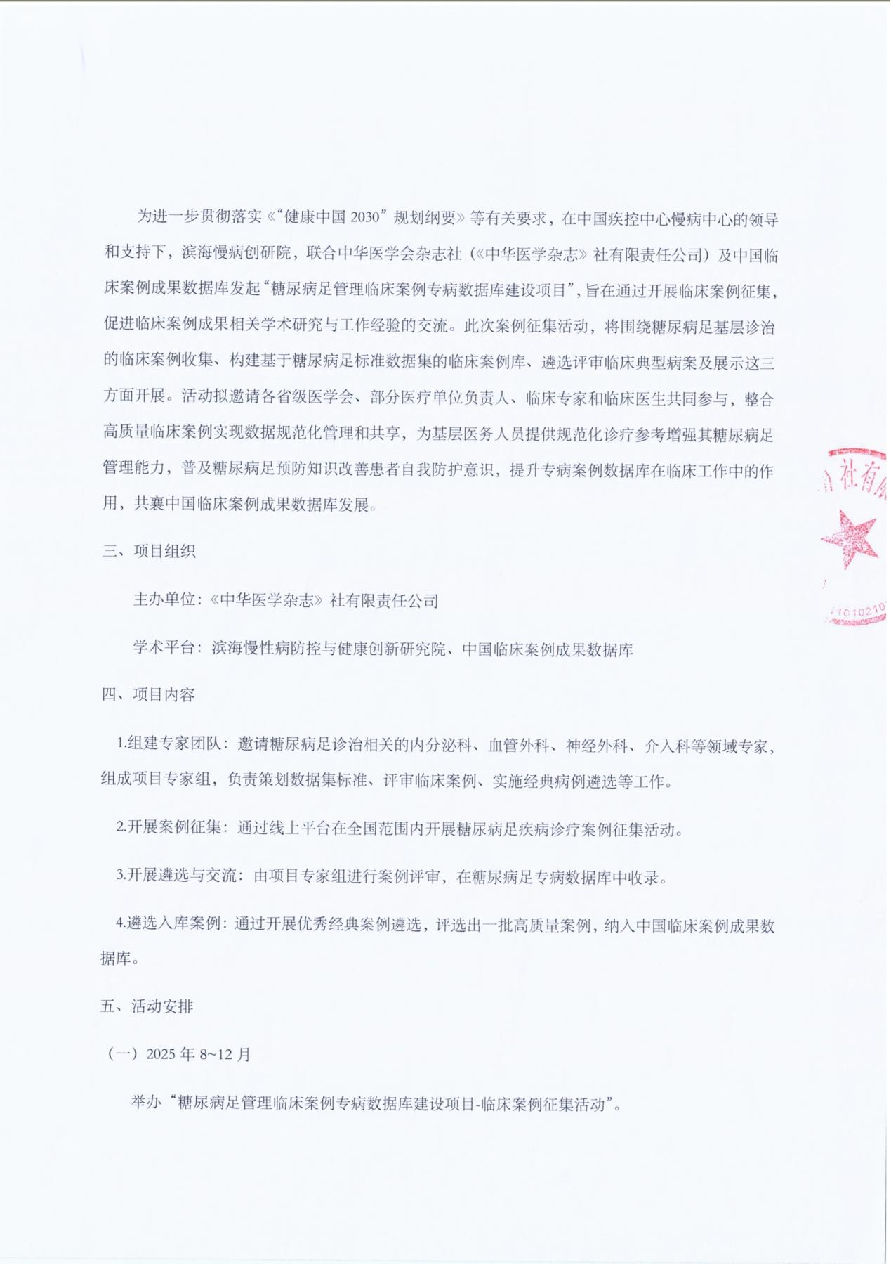为进一步推动糖尿病足管理领域临床实践经验的交流与学术研究,促进临床数据的标准化和智能化,中国疾病预防控制中心慢病管理中心联合中华医学会杂志社《中国临床案例成果数据库》编辑部,现正式启动“糖尿病足管理临床案例专病数据库建设项目”临床案例征集活动,诚邀广大基层临床工作者积极参与。